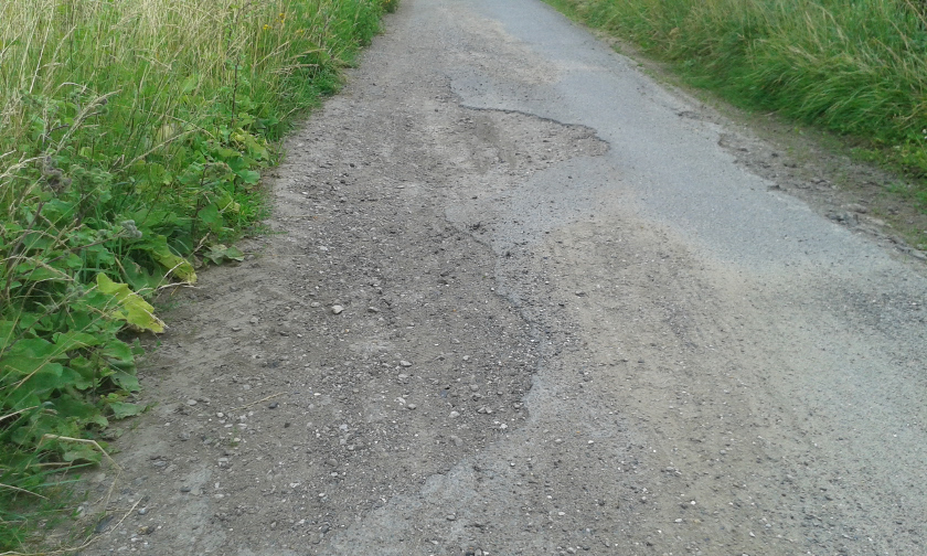 Wirtschaftsweg mit großflächigem Schlagloch als Radweg von Laatzen-Rethen zum Gewerbegebiet Rethen-Ost