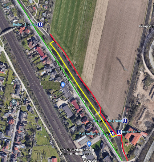 ⇒[ Zum Ratsbeschluss, den Schutzstreifen auf der Westseite statt auf der Ostseite einzurichten ] Wege für Radfahrer am geplanten Hochbahnsteig Rethen-Steinfeld Im Verkehrsentwicklungsplan (VEP) der Stadt Laatzen wird für den Verlauf des Wegs für Radfahrer an der Hildesheimer Str. von der Pattensener Str. bis zur Ahornstr. - also an der Ostseite der Hildesheimer Str. und damit auch im Bereich des geplanten Hochbahnsteigs - ein Radschutzstreifen an der Fahrbahn vorgeschlagen. Dies wurde bei der Ausarbeitung des VEP durch den ADFC ausdrücklich unterstützt. Während der Sitzung des Laatzener Ausschuss‘ Verkehrswende am 24.02.2021 wurde im TOP 5 “Planungsstand Neubau Hochbahnsteige“ auch der Hochbahnsteig Rethen-Steinfeld und in dessen Umfeld mögliche Verläufe der Wege für Radfahrer vorgestellt. Es wurden drei Alternativen vorgestellt: a.) Ein Weg zwischen dem Ackergelände und dem Baum-/ Buschbestand (rot) b.) Ein Weg in einer gedachten Gasse westlich der Stadtbahngleise und östlich der Baumreihe (gelb) c.) Ein Radschutzstreifen entlang der Fahrbahn (wie im VEP vorgeschlagen) (grün). Die drei Alternativen werden wie folgt bewertet: Zu a.) Dieser Weg verläuft abseits und entspricht damit nicht den Anforderungen “Soziale Sicherheit“ (insbesondere betroffen Frauen bei Dunkelheit). Der Weg ist zu beleuchten. Eine Einbeziehung in den Winterdienst ist aufwändig und wird leicht übersehen (siehe dazu auch Bericht des ADFC Laatzen auf der Homepage “Schneechaos auf Radwegen in Laatzen“). Der Weg kreuzt die Stadtbahngleise – auch schon im Bereich des geplanten Hochbahnsteigs “Rethen-Nord“ (also mehrmals). Kreuzungen von Stadtbahngleisen sind für Radfahrer problematisch – insbesondere wenn sinnvollerweise zur Sicherheit mit Drängelgittern versehen: für Fahrräder beladen mit Einkäufen sind die ein Hindernis. Da im Zuge der gewünschten Mehrnutzung des Fahrrades für die Verkehrswende und für den Klimaschutz mehr Fahrräder benutzt werden sollen und damit mehr Lastenräder und Räder mit Anhänger benutzt werden, passen diese durch die Drängelgitter oft gar nicht hindurch. Dieser Weg wäre auch ein beliebter Ausflugsweg für Fußgänger und damit nicht konfliktfrei – was ja bei der Anlage von Wegen für Radfahrer vermieden werden sollte. Zu b.) Alles was über die Alternative a.) zutrifft, trifft auch für diesen Weg zu. Ein Queren der Stadtbahngleise ist sogar noch zweimal häufiger. Zu c.) Alles was über die Alternativen a.) und b.) zutrifft, trifft für diesen Weg, den Radschutzstreifen nicht zu. Er ist auch zügig zu durchfahren (keine Verschwenkungen, keine Querungen der Stadtbahngleise). Durch die Beleuchtung der Fahrbahn ist der Radschutzstreifen ebenfalls (kostengünstig) mitbeleuchtet. Durch den Winterdienst auf der Fahrbahn wird der Radschutzstreifen ebenfalls gleich mitgeräumt (so sollte es jedenfalls sein). Zusammenfassung: Nach Abwägung der Vor- und Nachteile steht die Alternative c.), der Radschutzstreifen ganz oben in der Bewertung. Der Autor des VEP wusste sehr wohl, weshalb er nur diese Lösung vorgeschlagen hat. Die Alternativen a.) oder b.) eignen ggf. sich zusätzlich - und nur dann - zu c.) als Gehwege für Radfahrer frei. ⇒[ zum Seitenanfang ] 16.07.2021 - Rat der Stadt beschließt Schutzstreifen auf der Westseite statt auf der Ostseite der Hildesheimer Str. Auf der Sitzung des Ausschuss Verkehrswende am 24.02.2021 wurden der Schutzstreifen auf der Ostseite der Hildesheimer Str. und auch Alternativen für die Ostseite vorgestellt; die Fahrradpiktogramme sollten auf der westlichen Seite aufgebracht werden ⇒[ dahin gehen ]. Auch die Machbarkeitsstudie - vorgestellt im Ausschuss Verkehrswende am 10.06.2021 - in der favorisierten Variante 3 auf Seite 16 zeigt den Schutzstreifen noch auf der Ostseite der Hildesheimer Str. ⇒[ das in einem separaten Fenster ansehen ], Am 16.07.2021 beschloss der Rat der Stadt Laatzen, den Schutzstreifen auf der Westseite vorzusehen. Die vorgesehenen Piktogramme auf der Westseite sollen dann auf der östlichen Seite der Fahrbahn aufgebracht werden. Die Leine-Nachrichten berichteten am 17.07.2021 darüber. Der jetzt neu geplante Verlauf der Wege für Radfahrende zwischen Hochbahnsteig Rethen-Nord und Hochbahnsteig Steinfeld kann in ⇒[ einem separaten Fenster angesehen werden ]. Demnach sind vorgesehen: 1.) ein Schutzstreifen auf der westlichen Seite (d.h. in Richtung Rethen), 2.) Fahrradpiktogramme auf der Fahrbahn auf der östlichen Seite (d.h. in Richtung Grasdorf), 3.) ein Gehweg für Radfahrer frei (bis zum Hochbahnsteig Steinfeld in wassergebundener Oberfläche) östlich der Stadtbahnstrecke am Ackerfeld. Postiv ist hervorzuheben, dass auf der Fahrbahn - wie schon im Verkehrsentwicklungsplan - ein Schutzstreifen und auf der anderen Seite Fahrradiktogramme vorgesehen sind; auf welcher Seite, ob West oder Ost, ist dabei unerheblich. Als Nachteil ist zu vermerken, dass Radfahrende in Richtung Grasdorf von der Einfahrt der Buswendeanlage ausgehend erst auf einen kombinierten Geh-/ Radweg geführt werden, bevor sie nach Überquerung der Bahngleise die Fahrbahn mit den Piktogrammen erreichen. Auch an der Kreuzung mit der Straße zum Kompostplatz ist die Vorfahrtfrage nicht eindeutig. Es wird sicher Radfahrende geben, die den Umweg über den kombinierten Geh-/ Radweg umfahren werden und ab der Einfahrt der Buswendeanlage gleich auf der Fahrbahn verbleiben. ⇒[ zum Seitenanfang ] Eingaben "Wann" an "Wen" (Gemeinde, Region, etc.), Antworten "Wann", "Von": 05.03.2021 - Dieser Beitrag wurde der Niedersächsischen Landesbehörde für Straßenbau und Verkehr, der Infra (per Brief) und der Stadt Laatzen (per Email) übermittelt. 05.05.2021 - Die Niedersächsische Landesbehörde für Straßenbau und Verkehr/ infra antwortet (Erwiderung auf die Äußerung/ auf den Beitrag des ADFC Laatzen vom 05.03.2021): ⇒[ hier ansehen ]. Abgeschlossen, zurückgestellt ("Wann", "Grund"): Hier steht die Historie der Entwicklun
