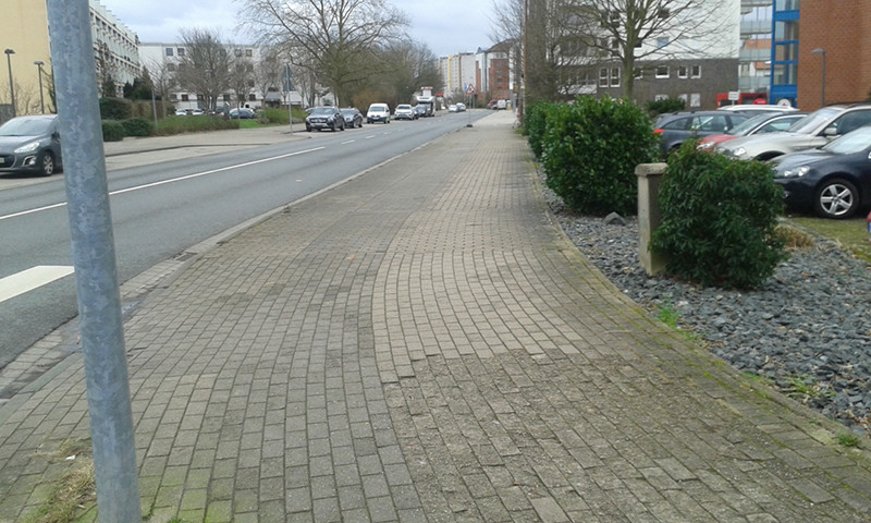 Der nicht benutzungspflichtige Radweg in der Gutenbergstr. (Westseite). Er beginnt an der Senefelderstr, Auffahrt vom Zebrastreifen aus. Der Farbunterschied zwischen Gehweg und Radweg ist nur gering (typisch für Laatzen), aber als baulicher Radweg erkennbar. |