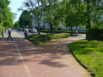 Vom Dahlienweg in das Lange Feld. Letztere Straße knickt ab. Geradeaus wird der Radweg zu einem linken Radweg. |