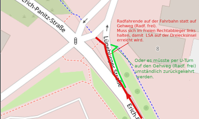 Radfahrende dürfen die Fahrbahn benutzen (kein Benutzungszwang des Gehwegs für Radfahrende frei). Damit die Lichtsignalanlage auf der Dreiecksinsel direkt erreicht werden kann und nicht die Fahrbahn im Freien Rechtsabbieger selbst gequert werden muss, macht es Sinn, dass im Freien Rechtsabbieger ganz links gefahren wird. Oder es müsste per U-Turn umständlich auf den Gehweg (Radf. frei) zurückgekehrt werden. Das zeigt, wie wenig daran gedacht wurde, dass Radfahrende die Fahrbahn nutzen dürfen. Für Radfahrende aus Laatzen-Mitte, die auf der Fahrbahn fahren wollen, wird es noch kompizierter - siehe nächstes Bild. |