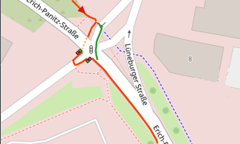 Sie müssen mit der Ampel die Erich-Panitz-Str. zur Bernd-Rosemeyer-Str. queren, dort einen U-Turn machen und rechts mit der Ampel in die Erich-Panitz-Str. in Richtung Rethen abbiegen. Oder man ist mutig und ordnet sich mit den Kfz auf der linksabbiegenden Spur der Lüneberger Str. ein und biegt damit links in die Erich-Panitz-Str. ein (grüner Verlauf). |