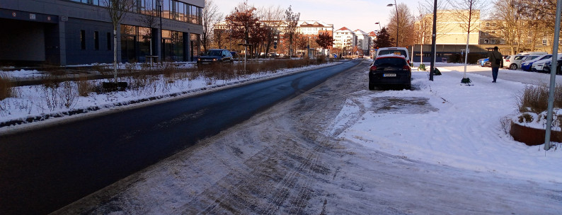 Schnee und Eis gefährden Radfahrende: Sturzgefahr - Radfahrstreifen an der Marktstr. nicht geräumt.