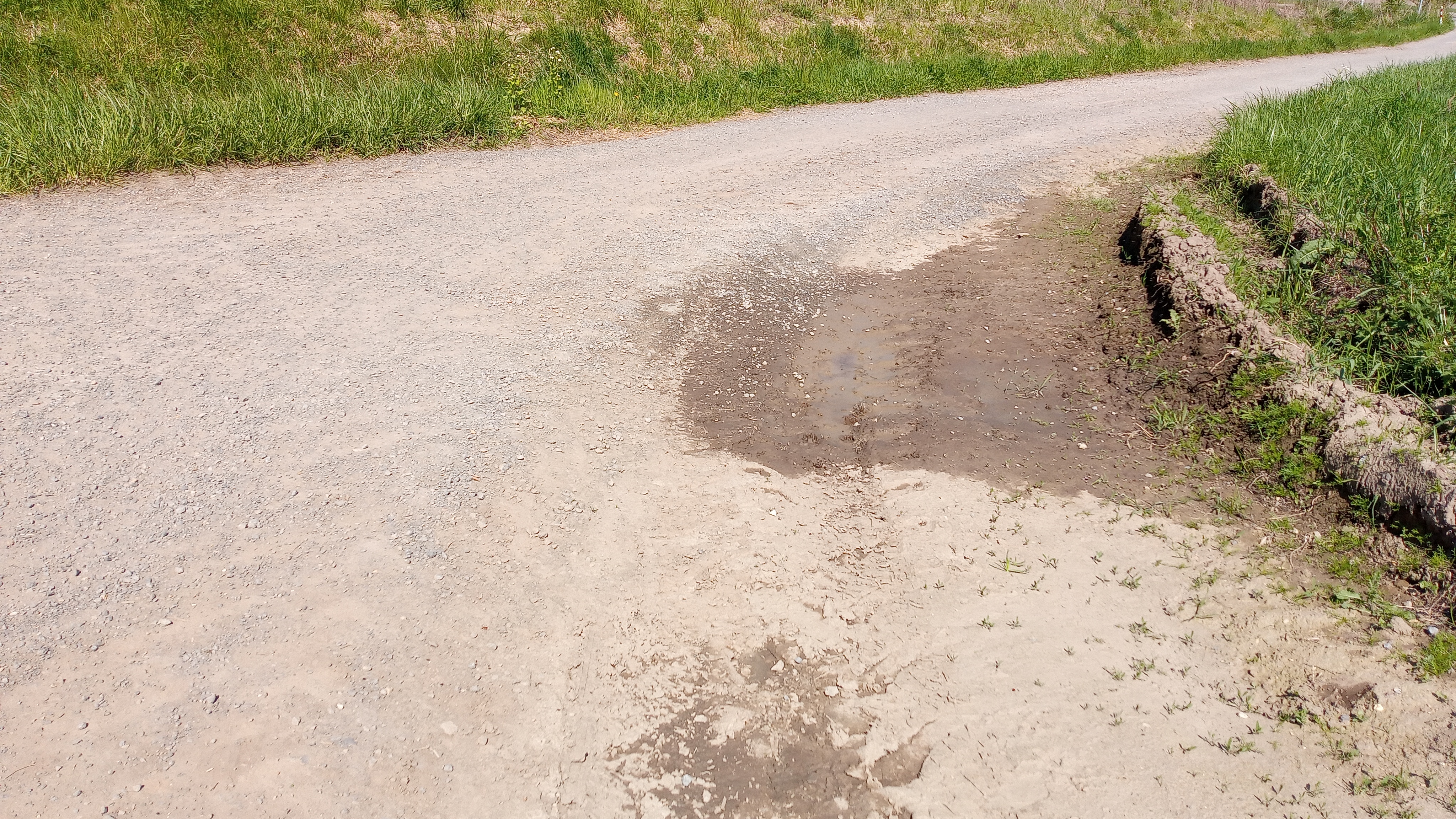 Der Mangel könnte besser behoben sein (Stand: 01.05.2025). Der Bereich wurde nur leicht verfestigt und wird durch schwerere Fahrzeuge (Landwirtschftliche Fahrzeuge, Einsatzfahrzeuge) wieder aufgeweicht. Ort: L 9.842330, B 52.29843, Kurve vor dem Wendekreisel der Krauss-Maffei-Str. |